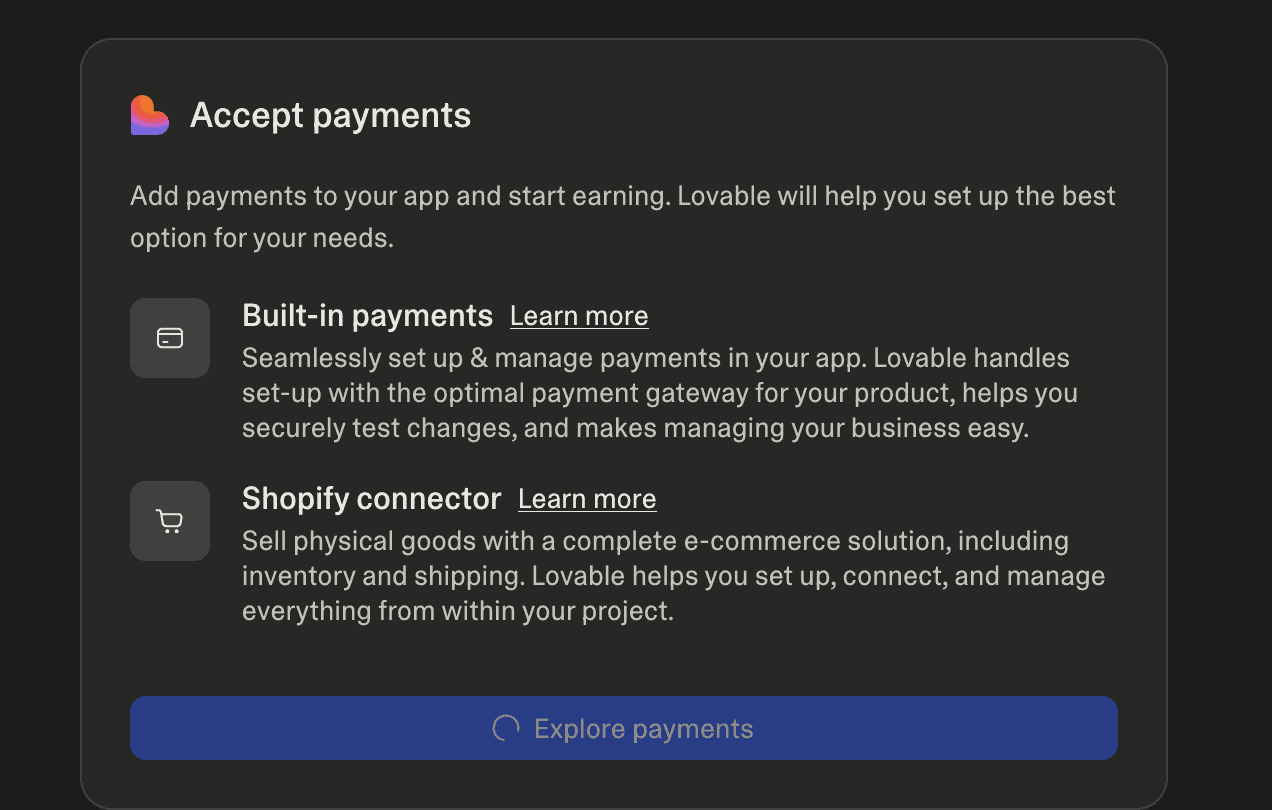 Lovable Payments is the built-in monetization path for apps on Lovable. You tell Lovable you want to accept payments, it creates your Paddle or Stripe account, builds the checkout flow, and wires up the UI inside the editor.