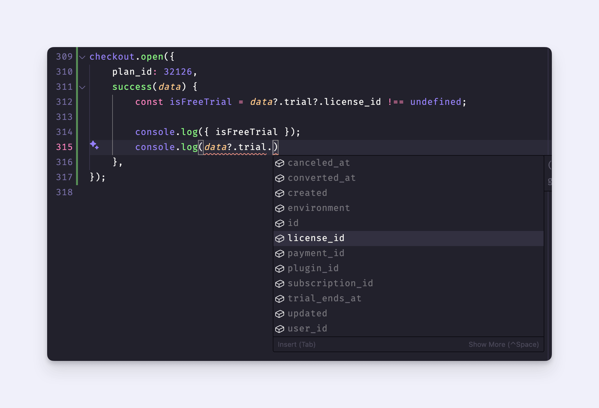 Previously, in the success callback, you couldn’t access structured data when a free trial was triggered. With this release, the data is now available under the data.trial property with full type annotations, making it easier to build consistent post-trial experiences.