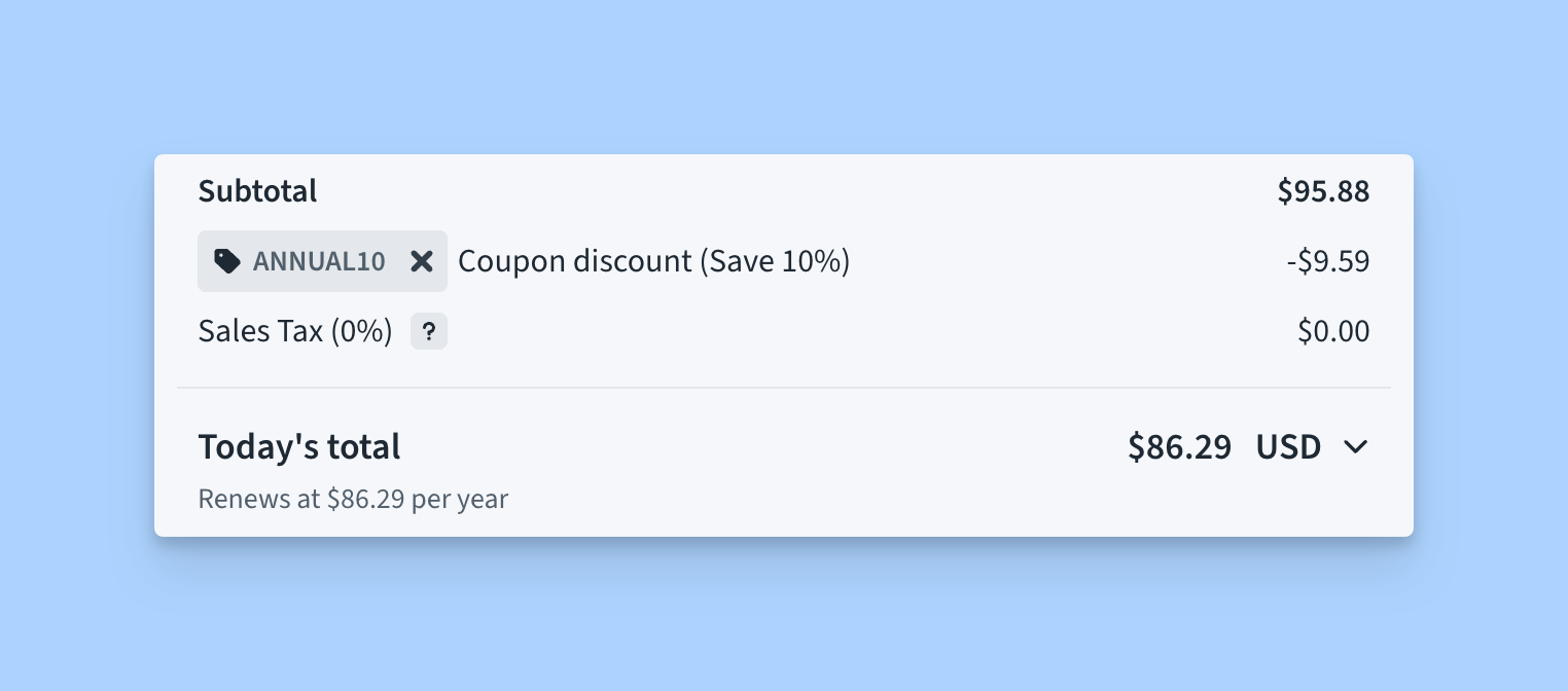 coupon-added: Triggered when a new coupon is applied through the checkout UI.coupon-removed: Triggered when a coupon is removed, either explicitly from the UI or when the coupon is no longer valid for the selected quota/licenses or billing cycle.coupon-updated: Triggered when a coupon’s discount value changes due to an update in quota/licenses or billing cycle.