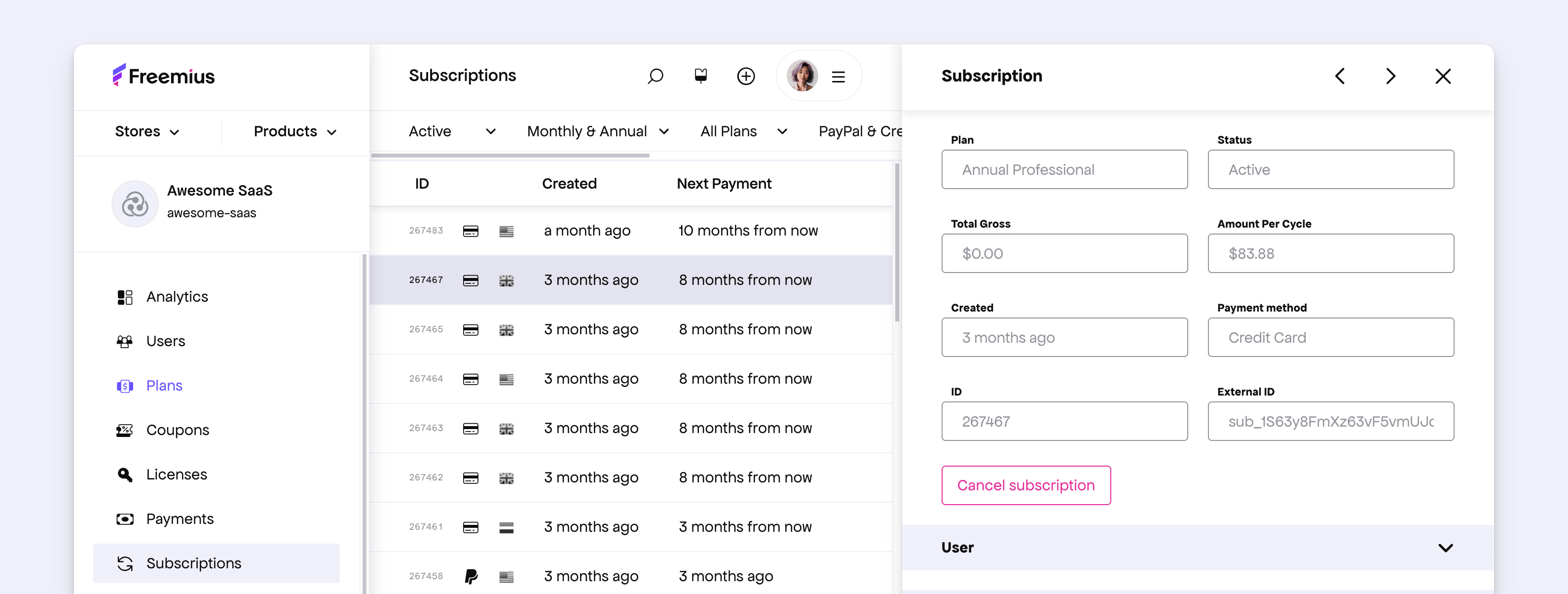 The Freemius Developer Dashboard allows you to manage your subscriptions with ease. From the Subscriptions page, you can view all active subscriptions, drill into detailed information, and cancel subscriptions when needed.