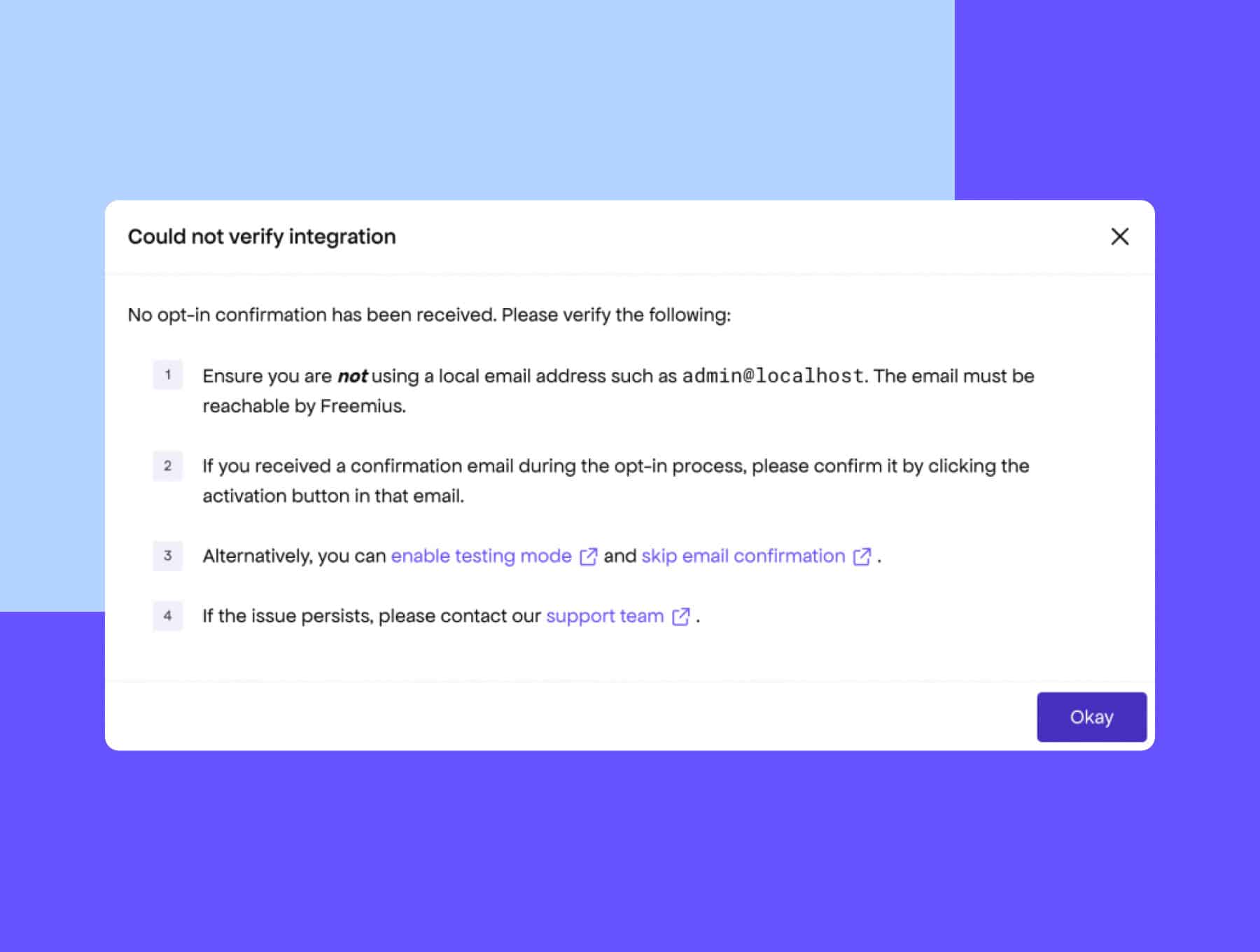 If a WordPress SDK integration can’t be confirmed, the setup flow now points out common issues and links to helpful docs, making it easier to spot missed steps or configuration problems.