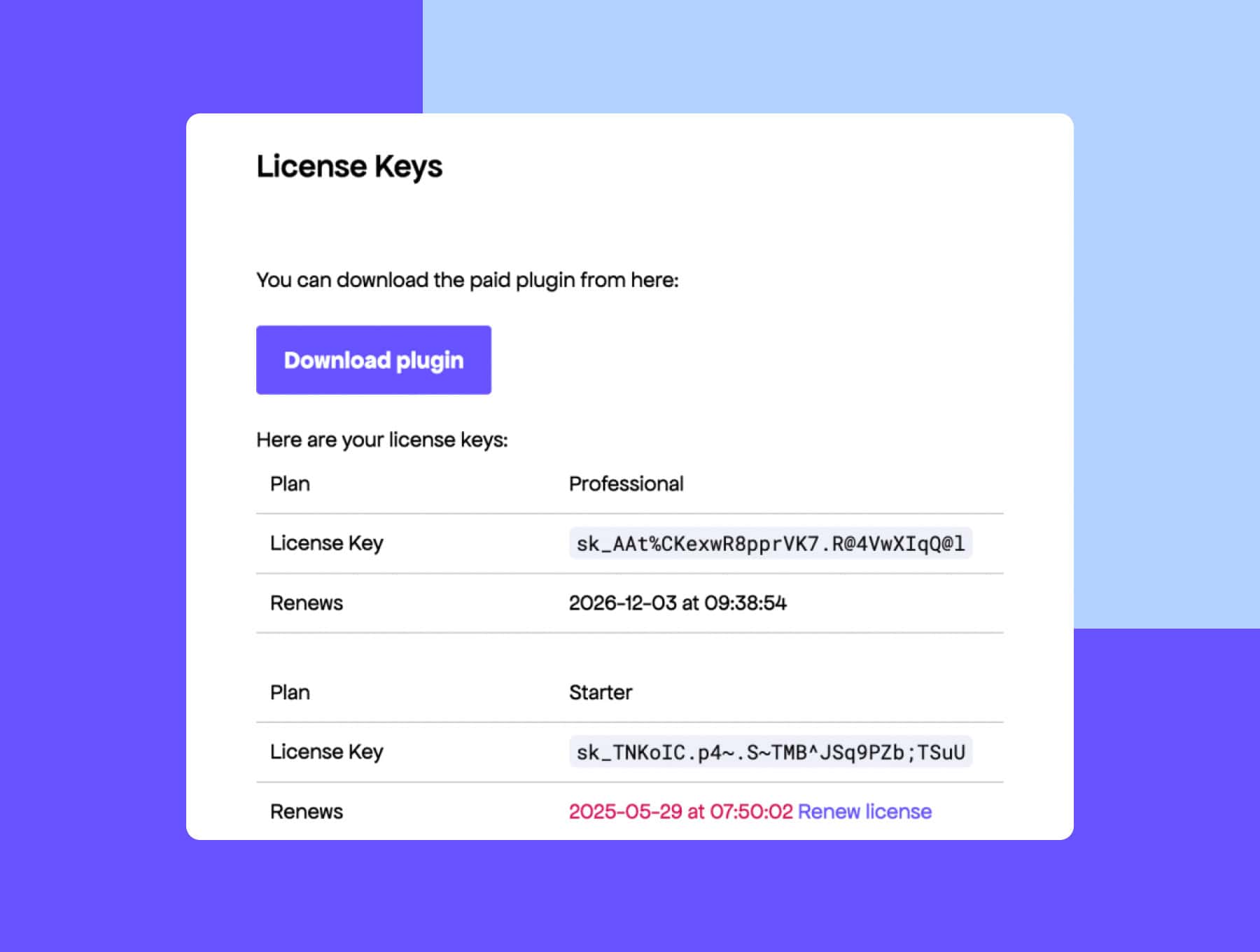 The tool lets buyers recover their licenses and download links on their own, with an email sent automatically — a small change that quietly cuts down on avoidable support tickets.