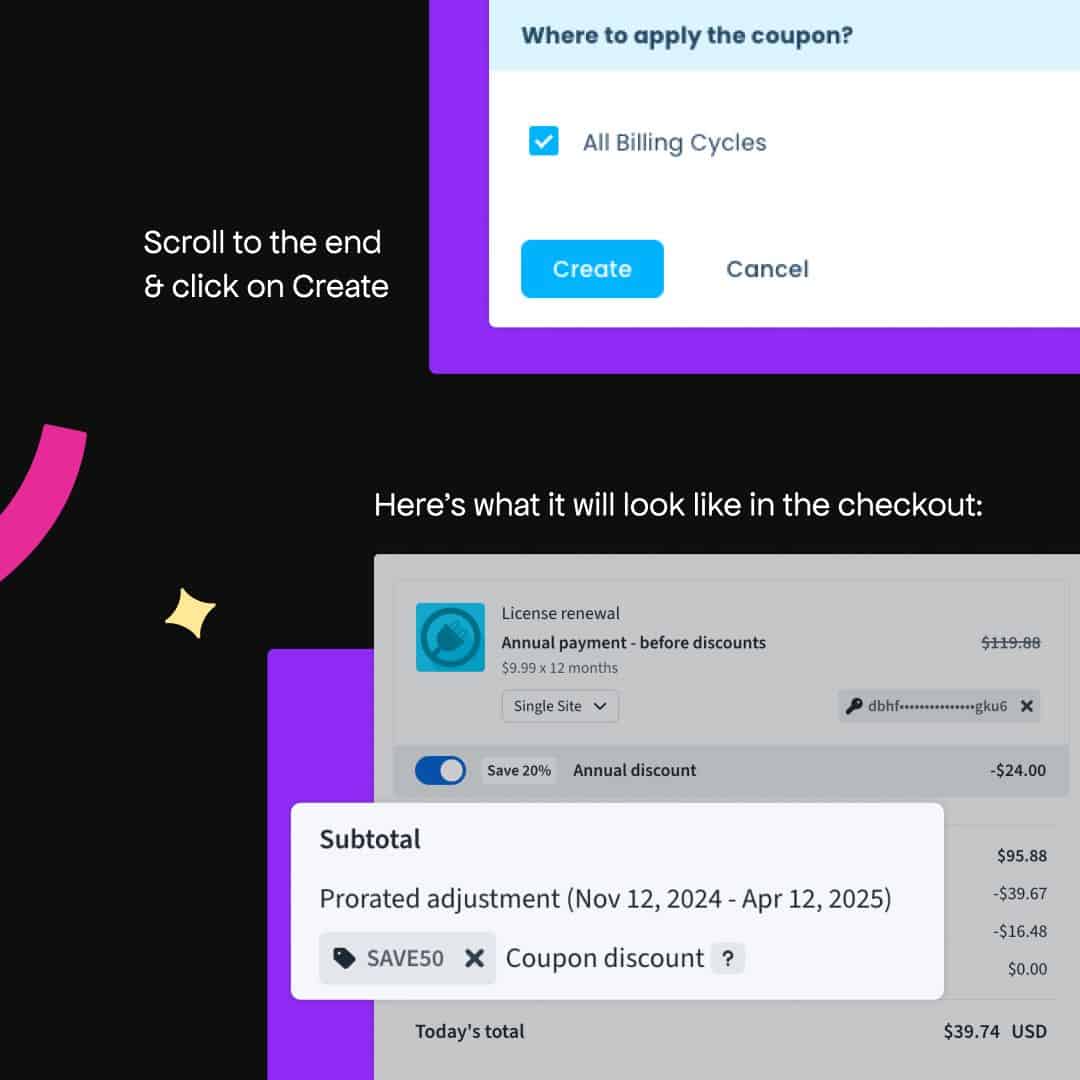 With Freemius, you can create multiple coupons with the same coupon code and different settings, and the checkout will automatically apply the coupon according to the state of the cart (the product, number of licenses, billing cycle, and more).