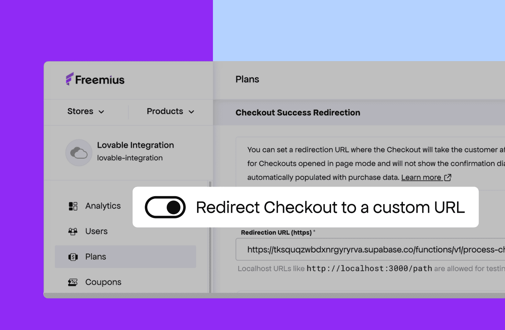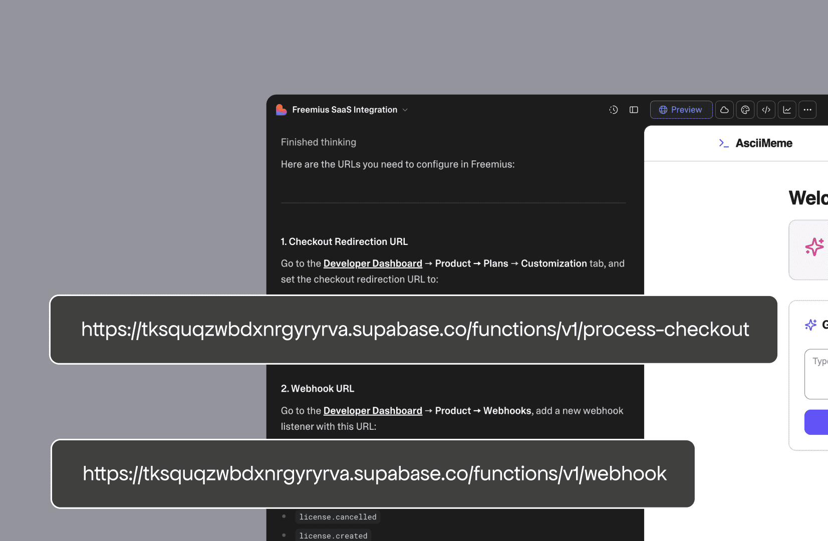 Publishing changes your app’s URL, which means the checkout and webhook URLs generated during integration point to the wrong place. Run this prompt to fix it: “If the app has been published, make sure to update all front-end URLs to point to the production URL instead of the local development URL inside _shared/freemius.ts.