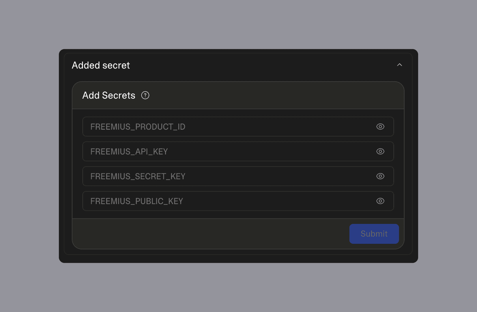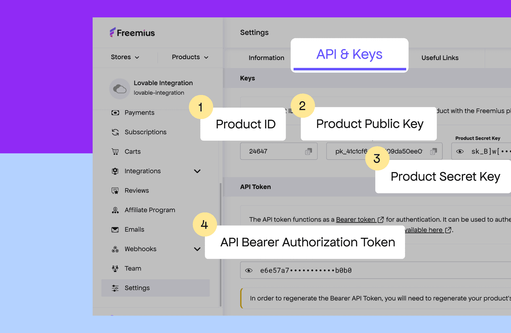 Once your plans are set, go to Product → Settings → API & Keys and find these four values:Freemius dashboard API & Keys