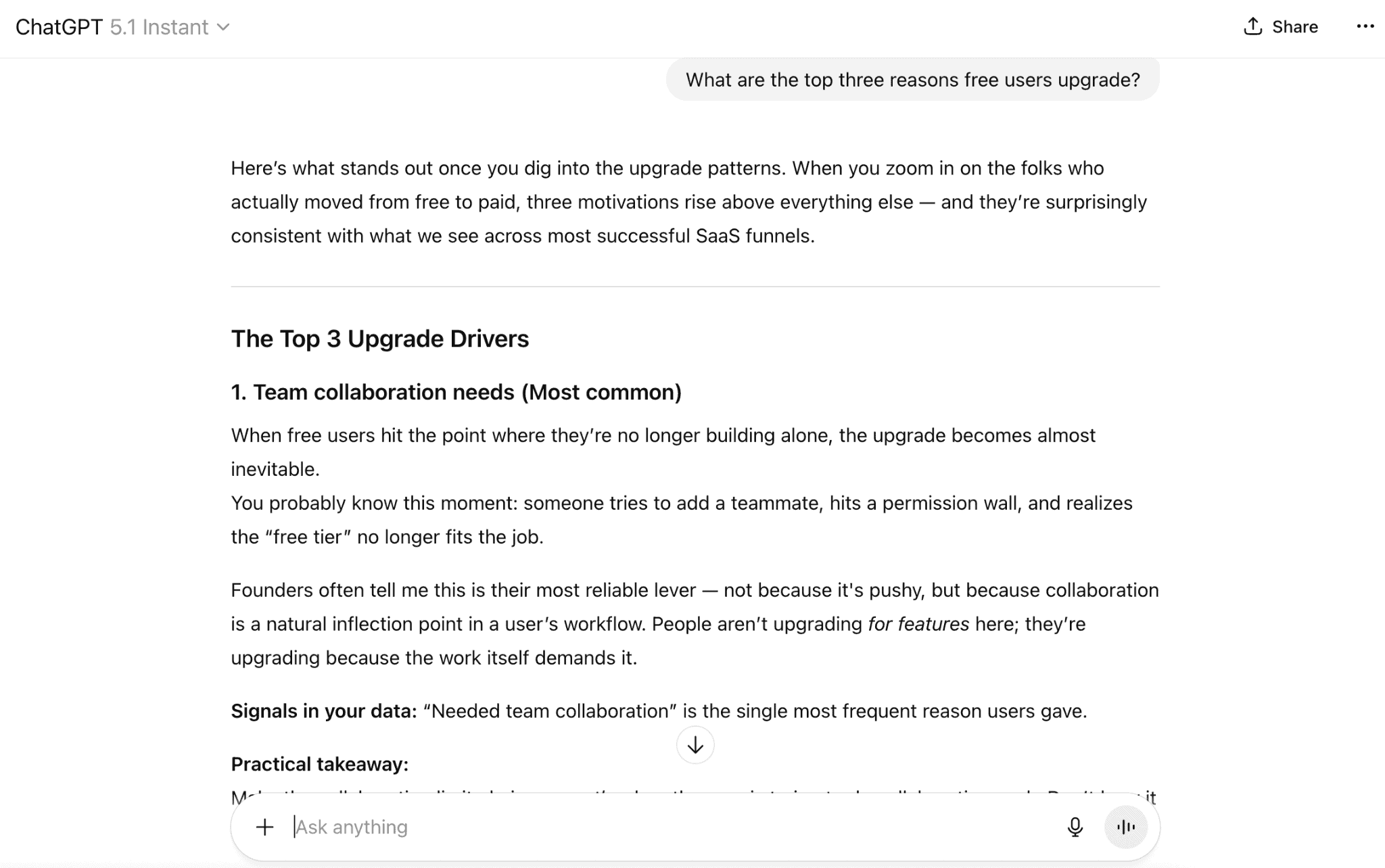 We used AI to craft short, targeted emails that spoke only to their implementation hurdle, mentioning the exact feature they’d stalled on. Instead of leading with a discount, we led with a fix. That small segment (7% of our trial users) converted at 4x the rate of our general list. — Dmitriy Shelepin