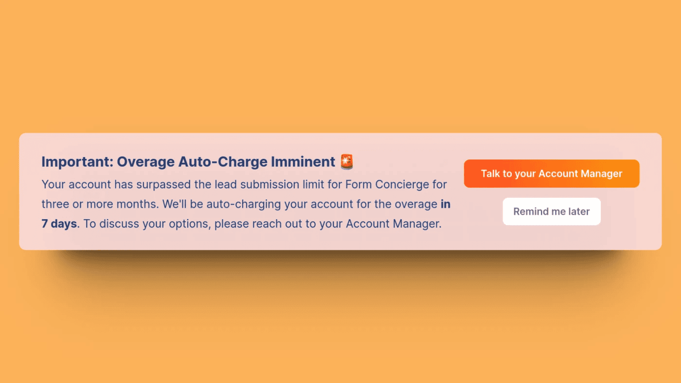 Chili Piper struggled to get this right with their Form Concierge product. When users exceeded their tier’s usage limit, they could only upgrade through their Account Manager via email.