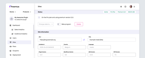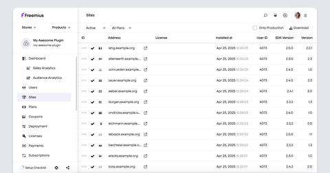 Under the ‘Sites’ tab you can see a table containing a list of the websites your plugin/theme was installed and activated on. You’ll be able to see the following: