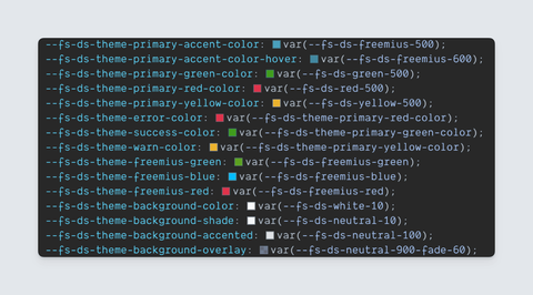 You will find that most variables come with a shade, for example --fs-ds-yellow-**100**, --fs-ds-yellow-**200**, etc. While replacing the colors, please try to keep the lightness at a similar level to the original color to make sure the contrast does not suffer.