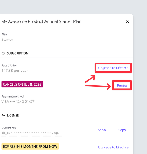 When the customer clicks the link, a secure page will open the checkout with the license key prefilled for the customer to renew their license or update their payment method.