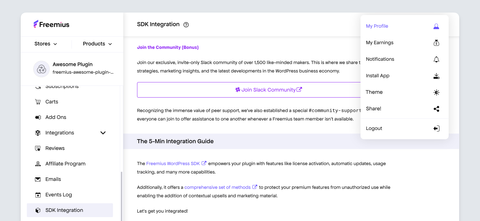 Important: To unlock all of the menu items and features of the Developer Dashboard, you’ll need to have made at least one sale of your product through Freemius. Before making a sale, your product is considered to be on the FREE plan. After you’ve made a sale, it’ll automatically be upgraded to the REVENUES plan.