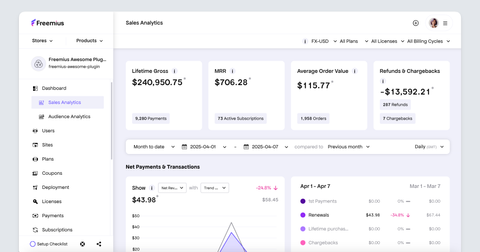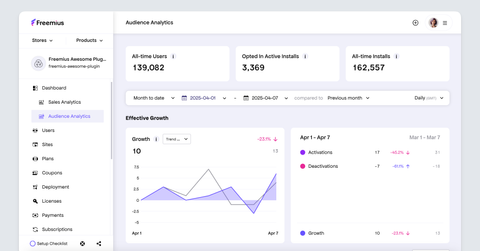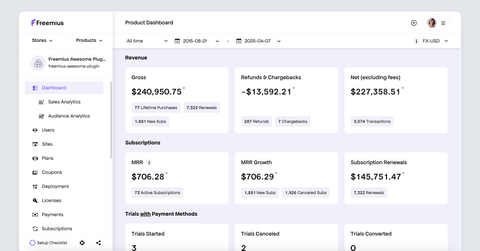 The Developer Dashboard is your main portal to the Freemius platform. In it, you can track important statistics, such as product sales and user opt-ins, manage products, licenses, customers, and much more!