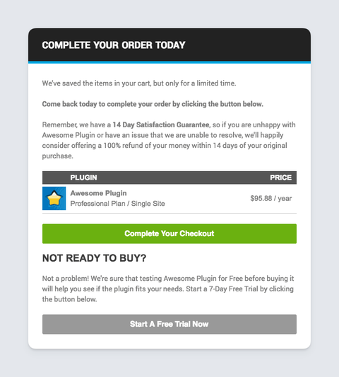 Once an email address is captured, a 60-minute countdown begins. If the visitor completes their checkout, Freemius just marks them as a normal completed checkout and takes no further action. But if the visitor does not complete their purchase - we trigger an automated email campaign designed to bring them back to your site (or their WP Admin) to complete the purchase.