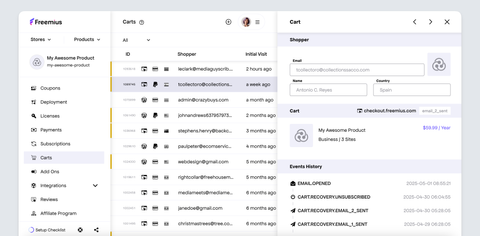 Based on studies, 7 out of 10 people who start a checkout process will abandon it before completing the transaction. A common technique to recover some of these lost customers is a Cart Abandonment Recovery emails campaign. Freemius comes with a fully-featured Cart Abandonment Recovery mechanism that will work for you automatically, and out of the box.
