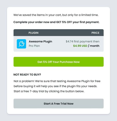 This special coupon integrates with the Cart Abandonment Recovery mechanism. In addition to surfacing your money-back guarantee and encouraging users to subscribe for a trial (if you have one), you can offer a discount as an extra incentive to encourage more prospects to complete the checkout they've abandoned.
