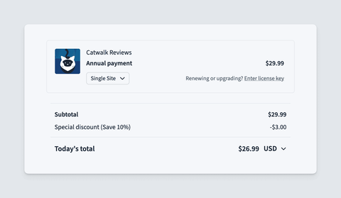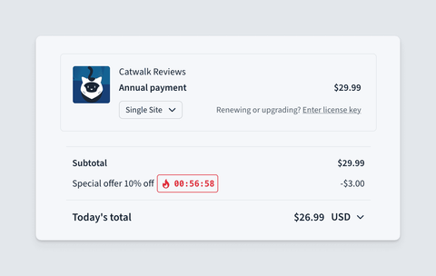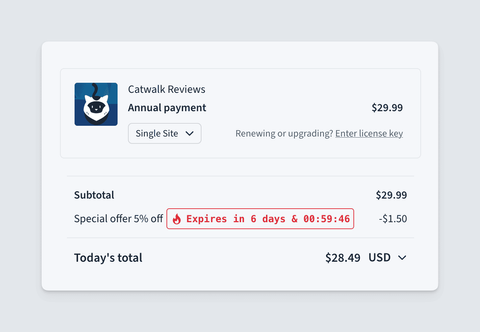 Clicking the button opens the checkout with the discount applied (without revealing the coupon’s code). A countdown is displayed to encourage users to take action, clearly informing them that the discount will expire when the license expires: