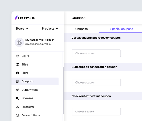 All special coupons require a discount coupon to be created. Click here to learn how to create discount coupons with various configurations like lifespan, types, renewals, plans, pricings, billing cycles, and eligibility.