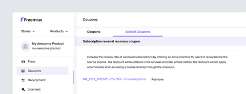 Freemius does not endorse discounting automatic renewals, and businesses have since shifted away from this practice. If you do not offer a discount for automatic renewals, we strongly recommend utilizing this coupon to win customers back into an active subscription.