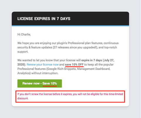 Once set, the discount is incorporated into the manual renewal recovery email campaign automatically. This helps to capture customers who are on the fence about renewing before their license expires.