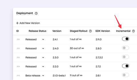 On the Deployment page of the Developer Dashboard, you will find a table listing all the deployed versions of your product. For each deployed version, a new switch has been added under the new Incremental column.