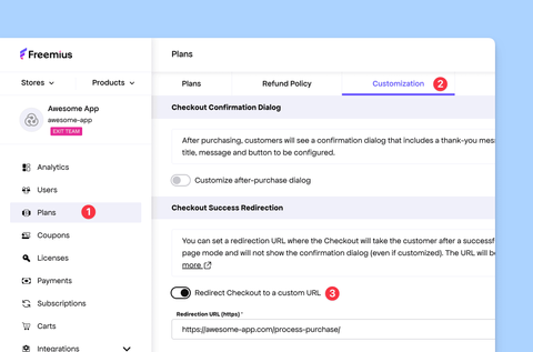 To ensure a smooth user experience, you need to set up redirects for the Freemius Hosted Checkout links.