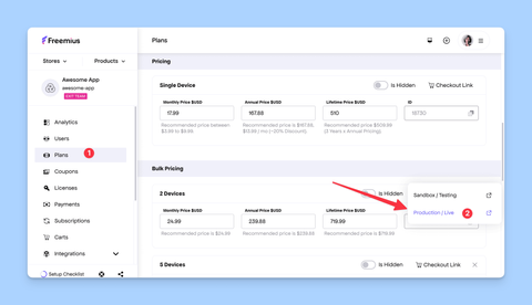 The easiest way to integrate Freemius Checkout with your app is by using the links generated from the Freemius Developer Dashboard.