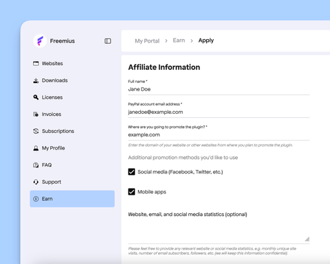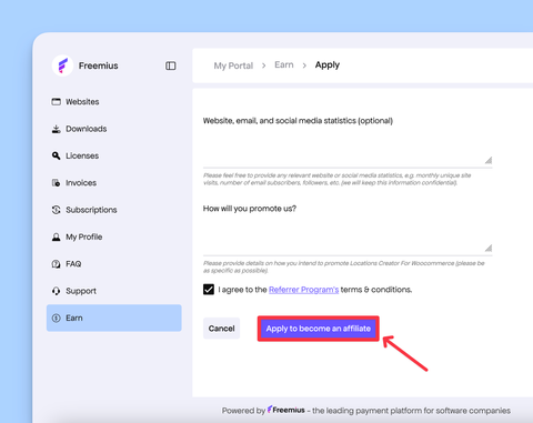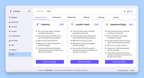 Freemius Makers have an affiliate program out of the box that enables their product users market the products they use and earn sales commission.