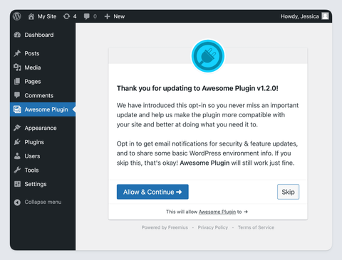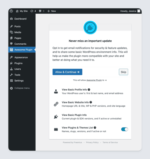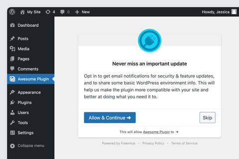 The Freemius SDK comes with a default opt-in screen that has gone through many improvement iterations to maximize clarity and optimize conversion rate while adhering to the standard WP Admin UI styles.
