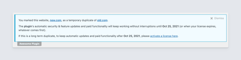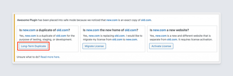 If the website is a duplicate for testing, staging, or development, clicking the "Duplicate Website" will resolve the situation. The plugin/theme will remain fully functional, and automatic updates will be served as usual for 2 weeks (or until license expiration, whichever comes first).