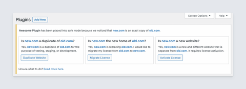 If the new site URL is replacing an old site’s URL, clicking the “Migrate License” (or “Migrate”) will migrate the site’s data, including the license, to the new website. And place the old site, if it still exists, into a safe mode. The most common case for this is taking a site from development (or staging) to production.