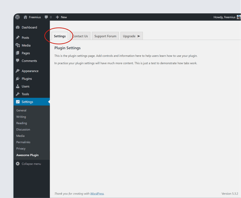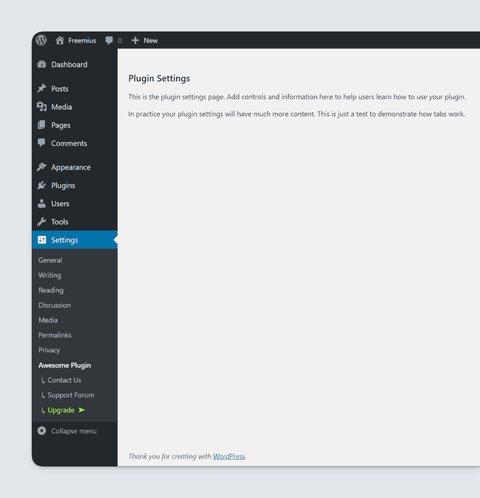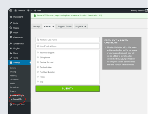 You might notice that when you click on a Freemius tab (e.g. Contact Us) a submenu item is displayed under the plugin settings menu to indicate which tab is currently visible. No submenu is displayed for the main plugin settings page.
