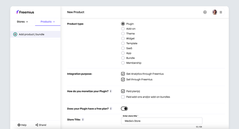 If you already created your “parent” product on Freemius, skip to #4. If not, create your “parent” plugin or theme by clicking the Add product / bundle button on the left side nav: