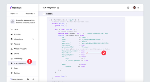 - Follow the SDK integration process carefully, step by step. If you already integrated Freemius into the parent product, you’ll need to update the generated SDK snippet (you'll notice a new flag named