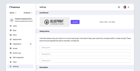 Unlike in your parent product, you’ll need to add some marketing material like: description, selling points, screenshots, and visual banners. These can be added via the Settings of the add-on product.