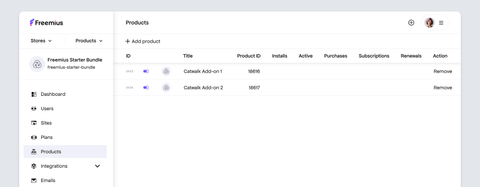A freemium Core Plugin called Freemius Starter Bundle with 2 paid plans (Starter: $100 per year; Professional: $150 per year), and two add-ons: