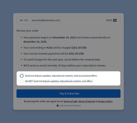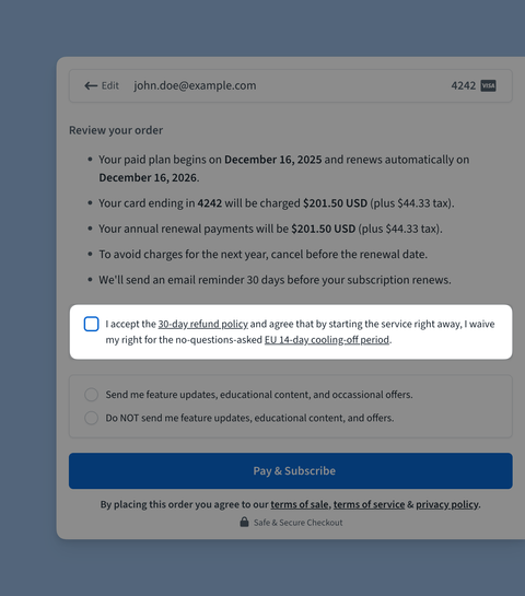 We could have designed the upgrade process slightly differently, emailing the downloadable product only after the payment approval, but we decided that we aren’t going to “break” a proper subscription UX just because of a small group of trolls that can abuse this PayPal flaw.