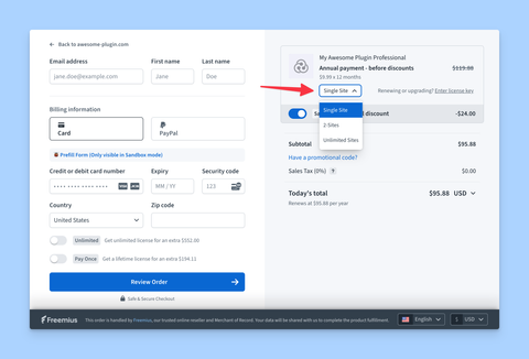 - [Showing Annual, Lifetime, and Unlimited Upsell Toggles in the Checkout](https://freemius.com/help/documentation/checkout/upsell-toggles.md): Increase sales conversion by displaying upsell toggles for annual, lifetime, and unlimited plans in the Freemius checkout.
