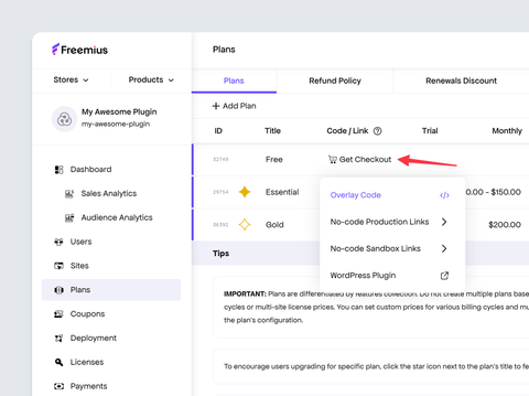 - [Explore the Developer Dashboard](https://freemius.com/help/documentation/getting-started/explore-the-developer-dashboard.md): The Developer Dashboard is your main portal to the Freemius platform. In it, you can track important statistics, such as product sales and user opt-ins, manage products, licenses, customers, and much more!