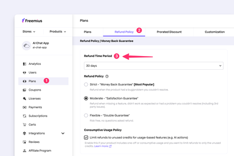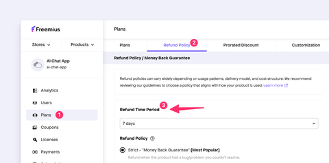 - [Setup Recommended Refund Policy for your SaaS or App](https://freemius.com/help/documentation/saas/setup-refund-policy.md): Set up a refund policy for your SaaS or App sold through Freemius. Explore our recommendations and available options.