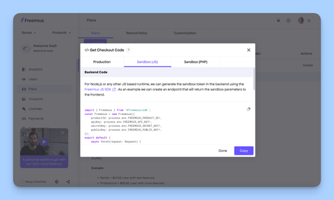 - [Checkout with the TypeScript Node.js SDK](https://freemius.com/help/documentation/saas-sdk/js-sdk/checkout.md): Guide on how to implement and manage the checkout process using the Freemius TypeScript Node.js SDK.