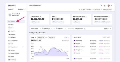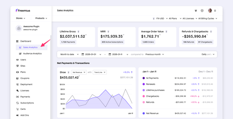 - [Sales Analytics](https://freemius.com/help/documentation/analytics/sales.md): Discover the Freemius Analytics Dashboard for sales performance data visualization.