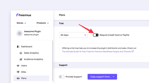 Yes. You can offer a [Free Trial with a required payment method](https://freemius.com/help/documentation/selling-with-freemius/free-trials/) by setting a trial period in your plan settings and then turning on the “Require Credit Card or PayPal” option.