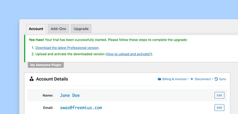 Clicking on the “Start free trial” button will redirect the user to the plugin’s in-dashboard pricing page with the option to start a trial with any of the plans. Once the user selects a plan and starts the trial, the premium version is securely accessible through a download link which will appear in an admin notice and in an automated email.