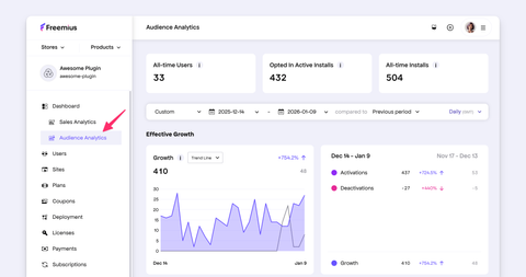 - [Audience Analytics](https://freemius.com/help/documentation/analytics/audience.md): Explore the Freemius Analytics Dashboard for user behavior and demographics data visualization.